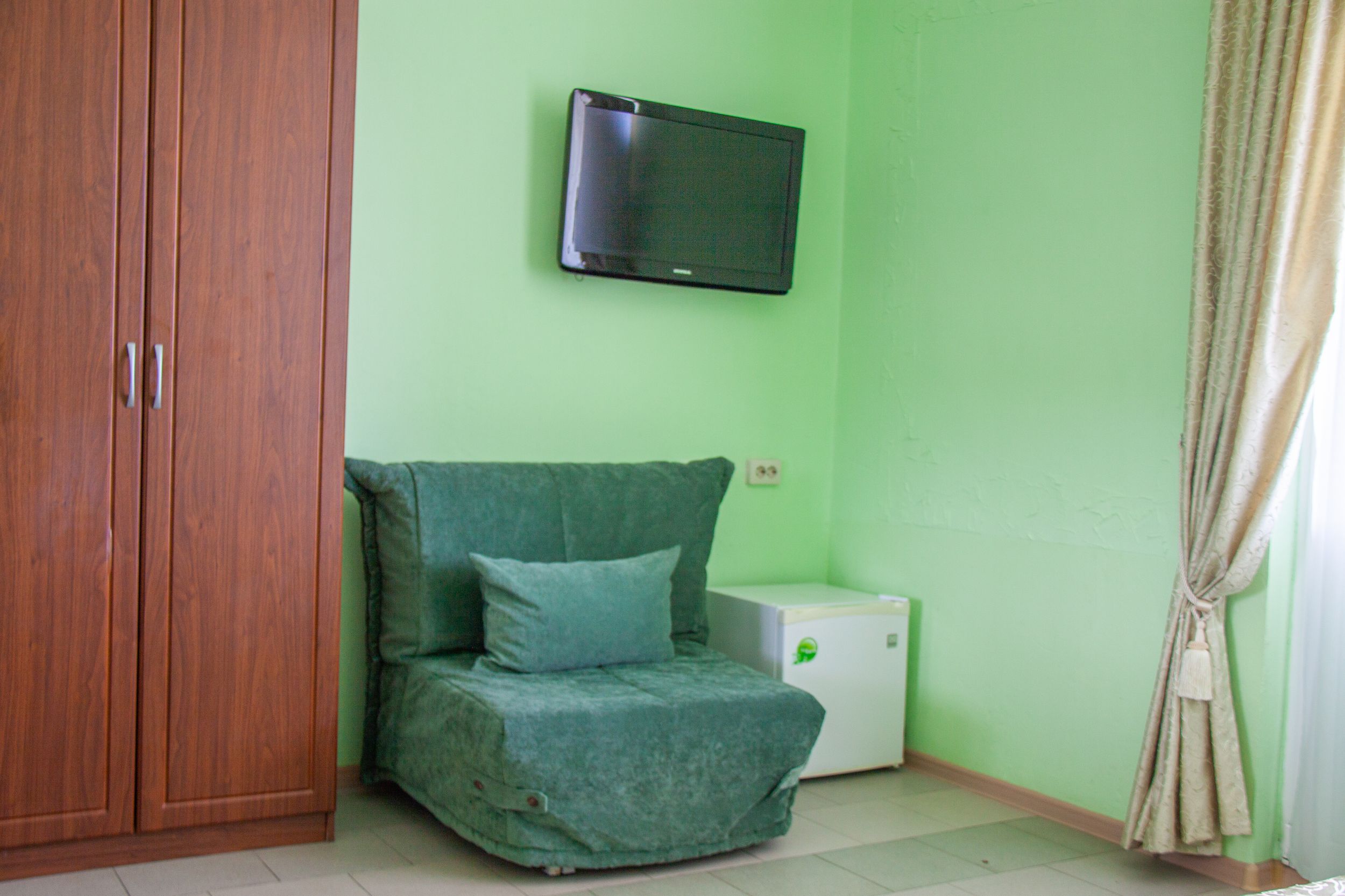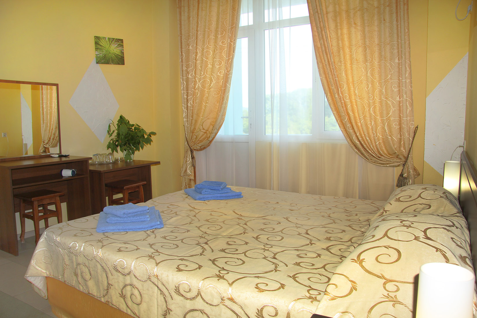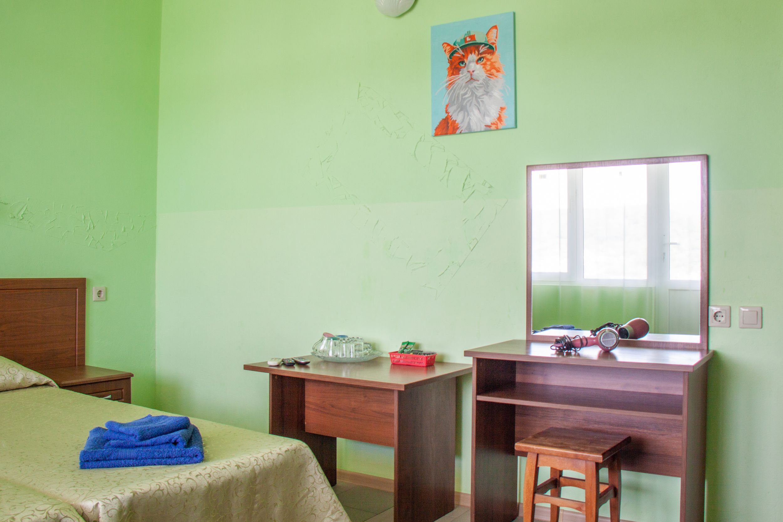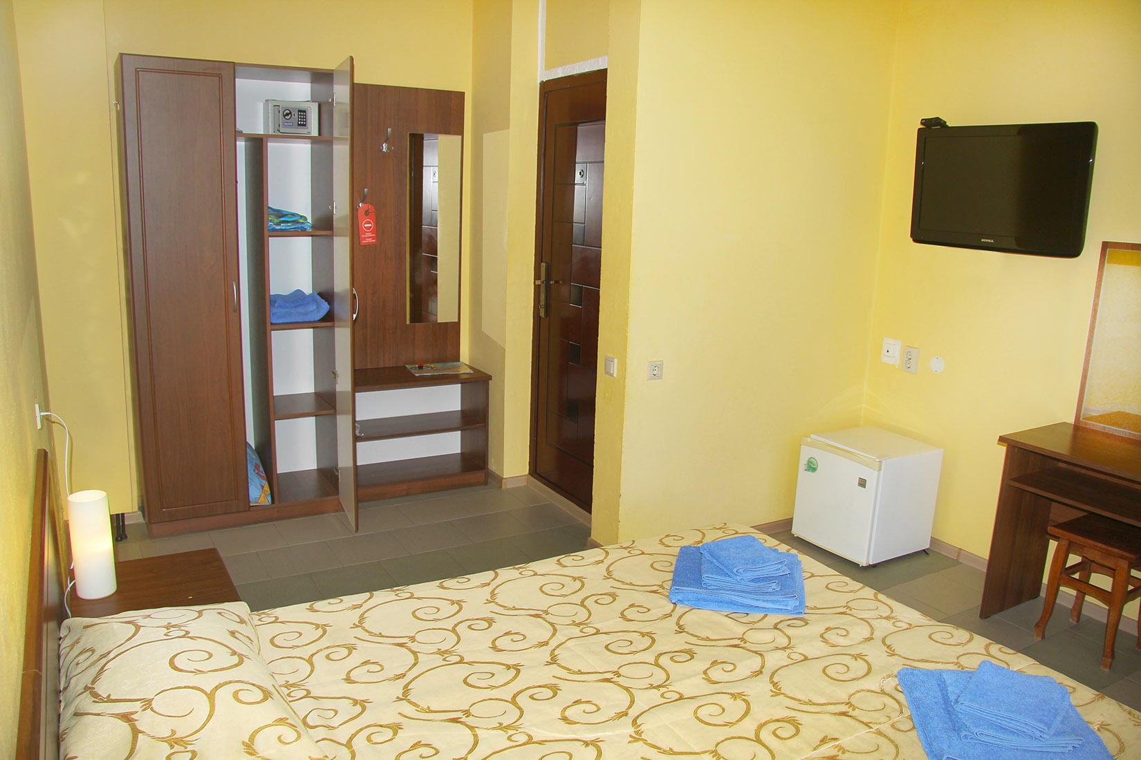 Номера с ванными комнатами оснащены душем. Из обустройства – мебель и спутниковое телевидение, холодильник и сплит-кондиционирование. В каждом номере можно организовать дополнительное место. Всего в пансионате 69 номеров.