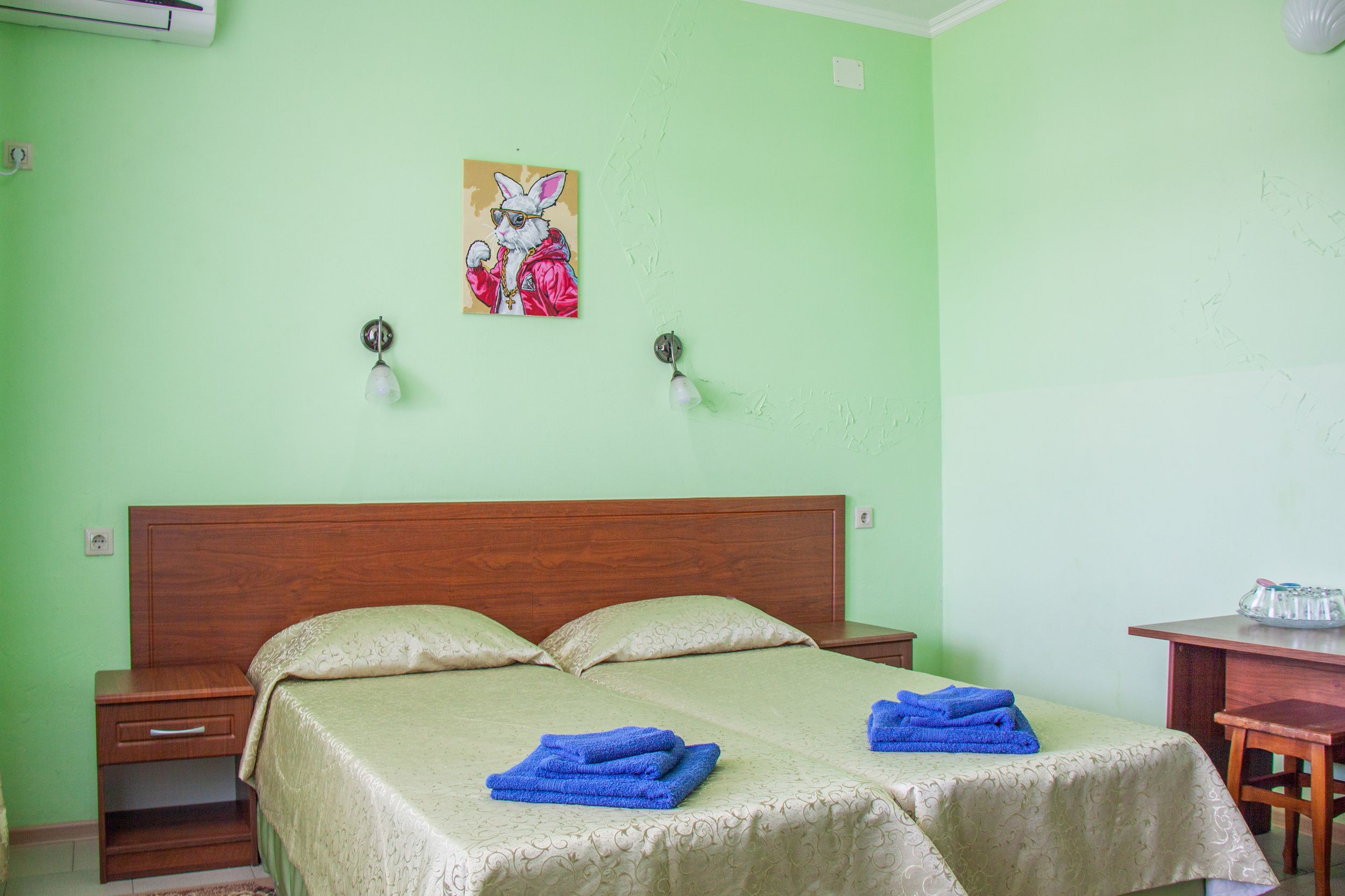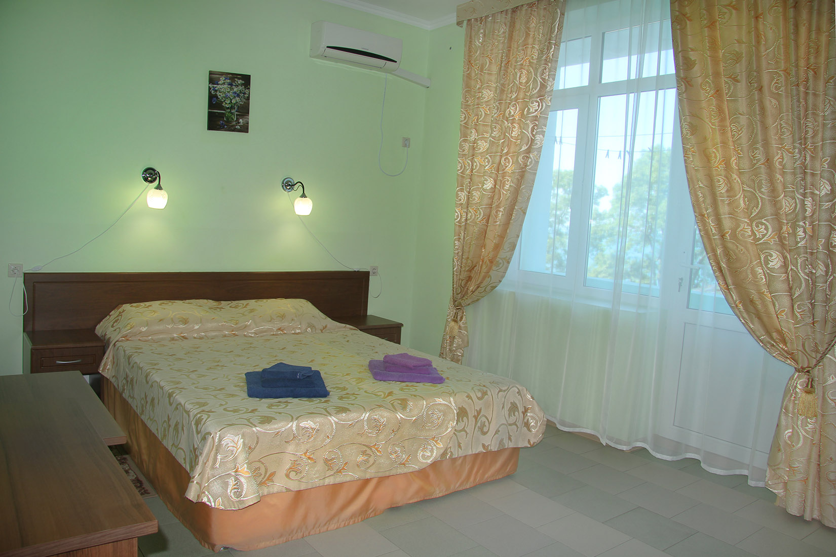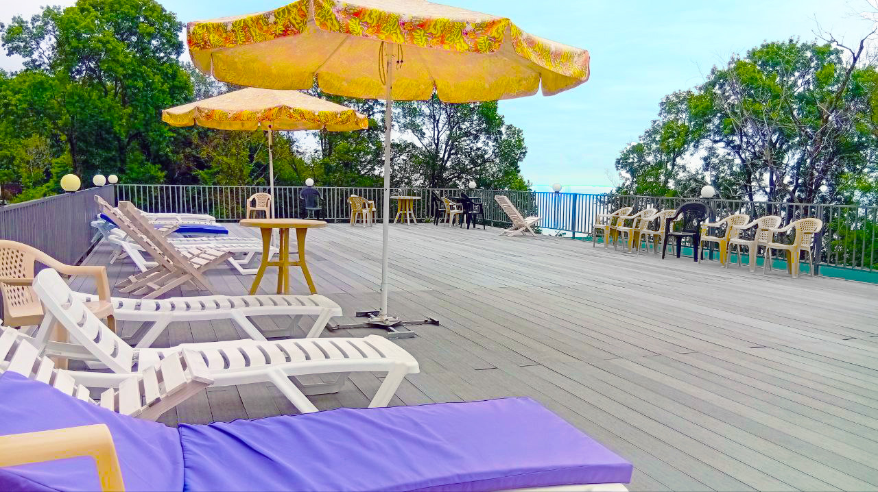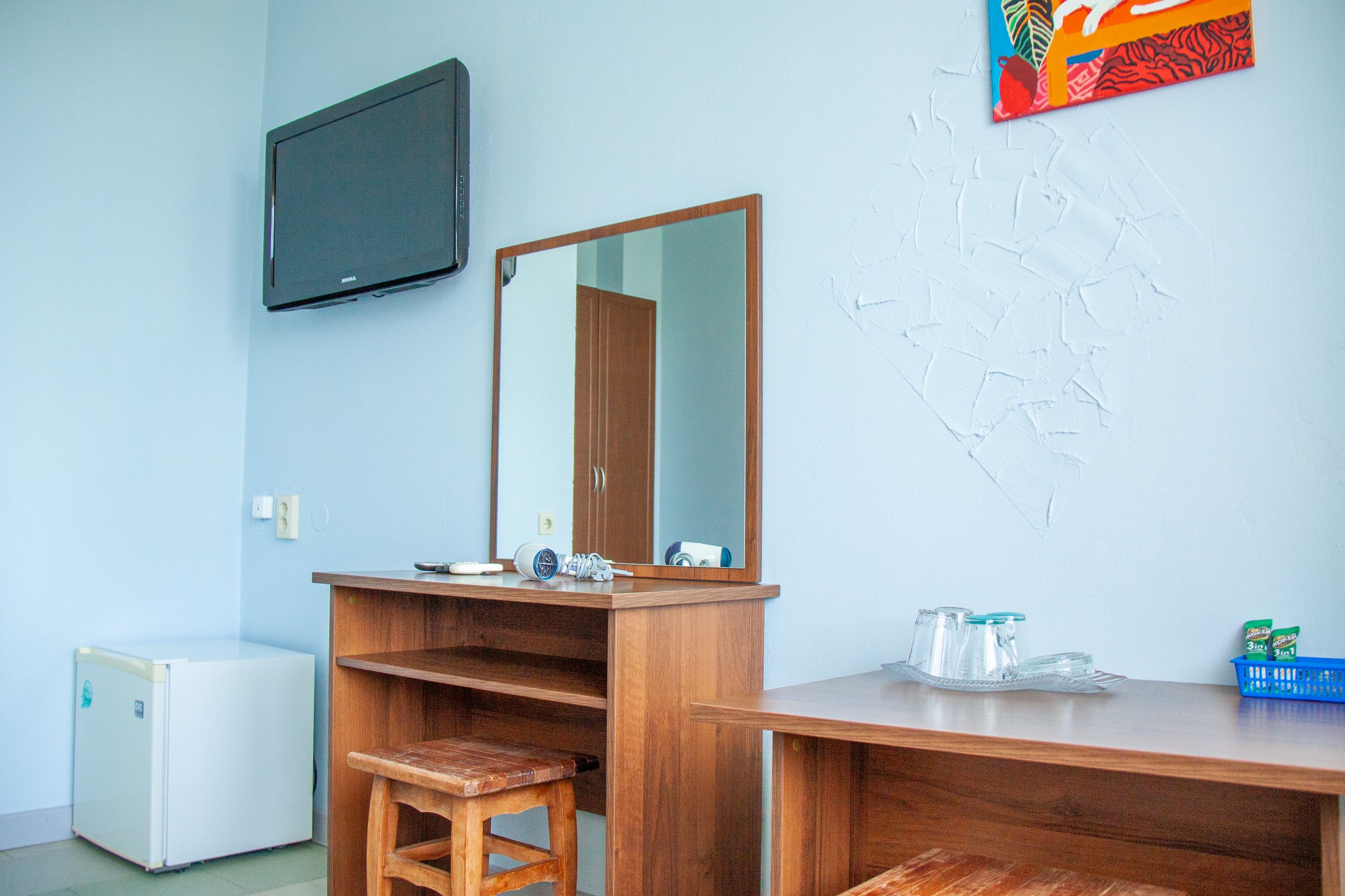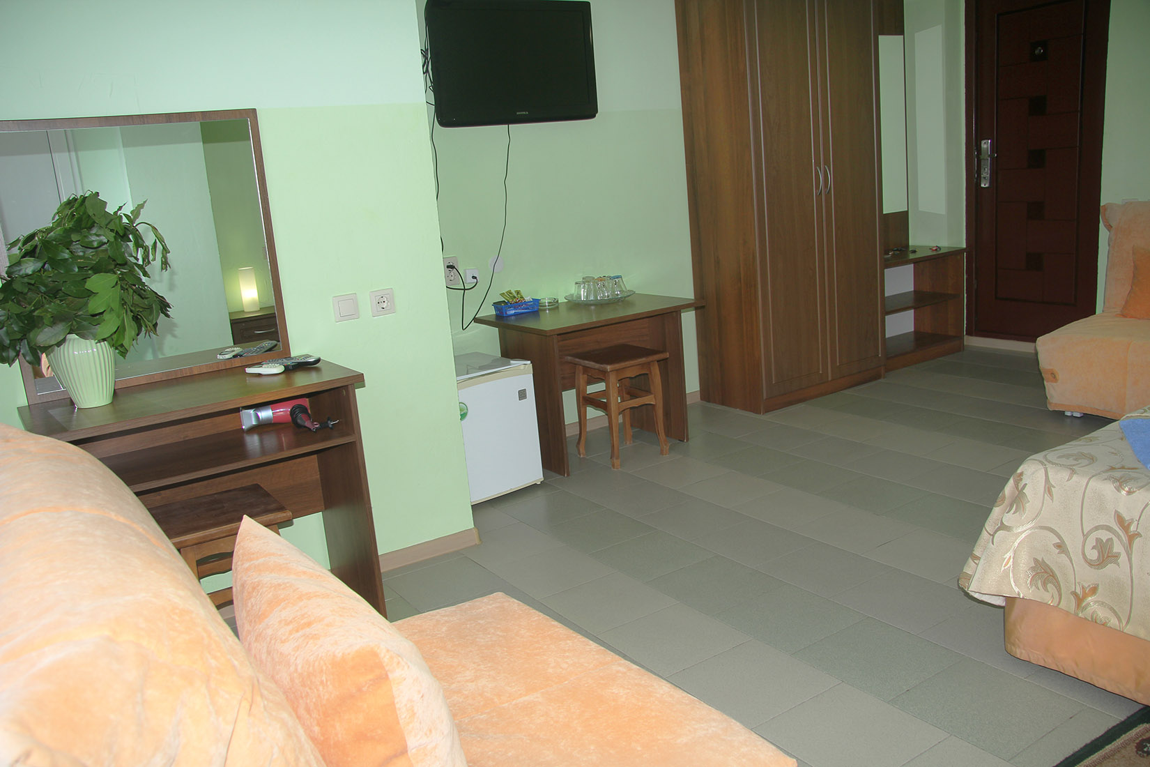Номера с ванными комнатами оснащены душем. Из обустройства – мебель и спутниковое телевидение, холодильник и сплит-кондиционирование. В каждом номере можно организовать дополнительное место. Всего в пансионате 69 номеров.