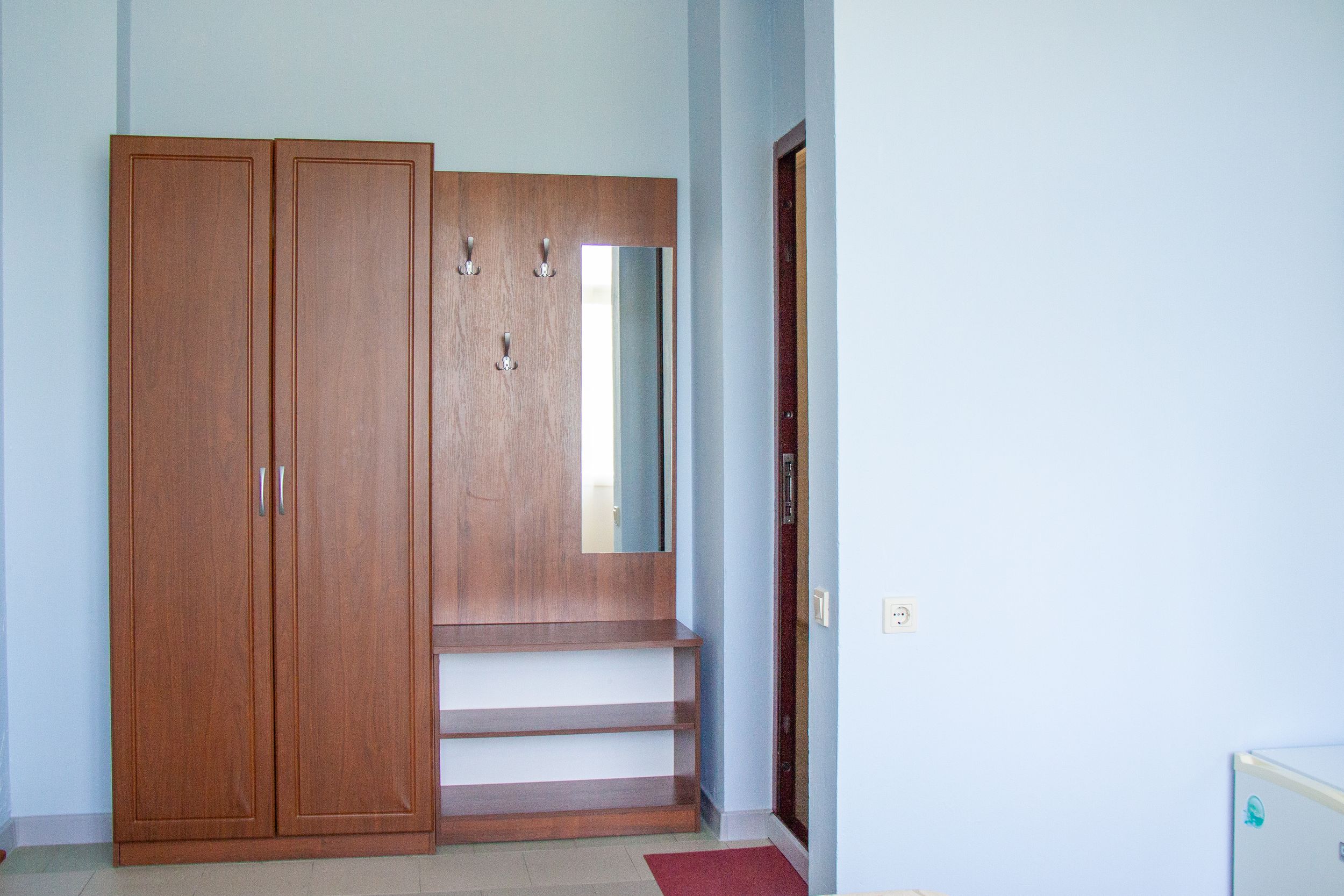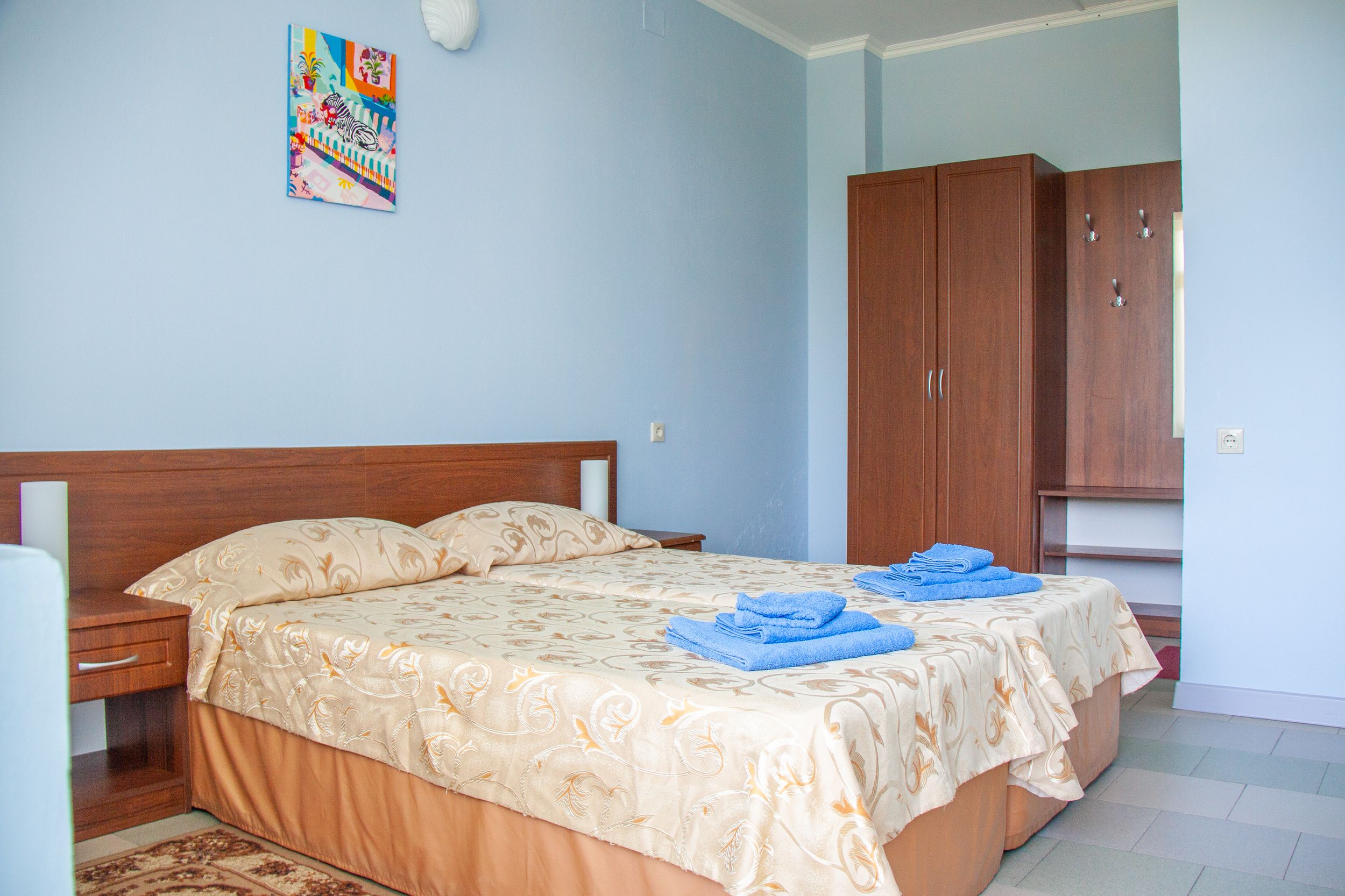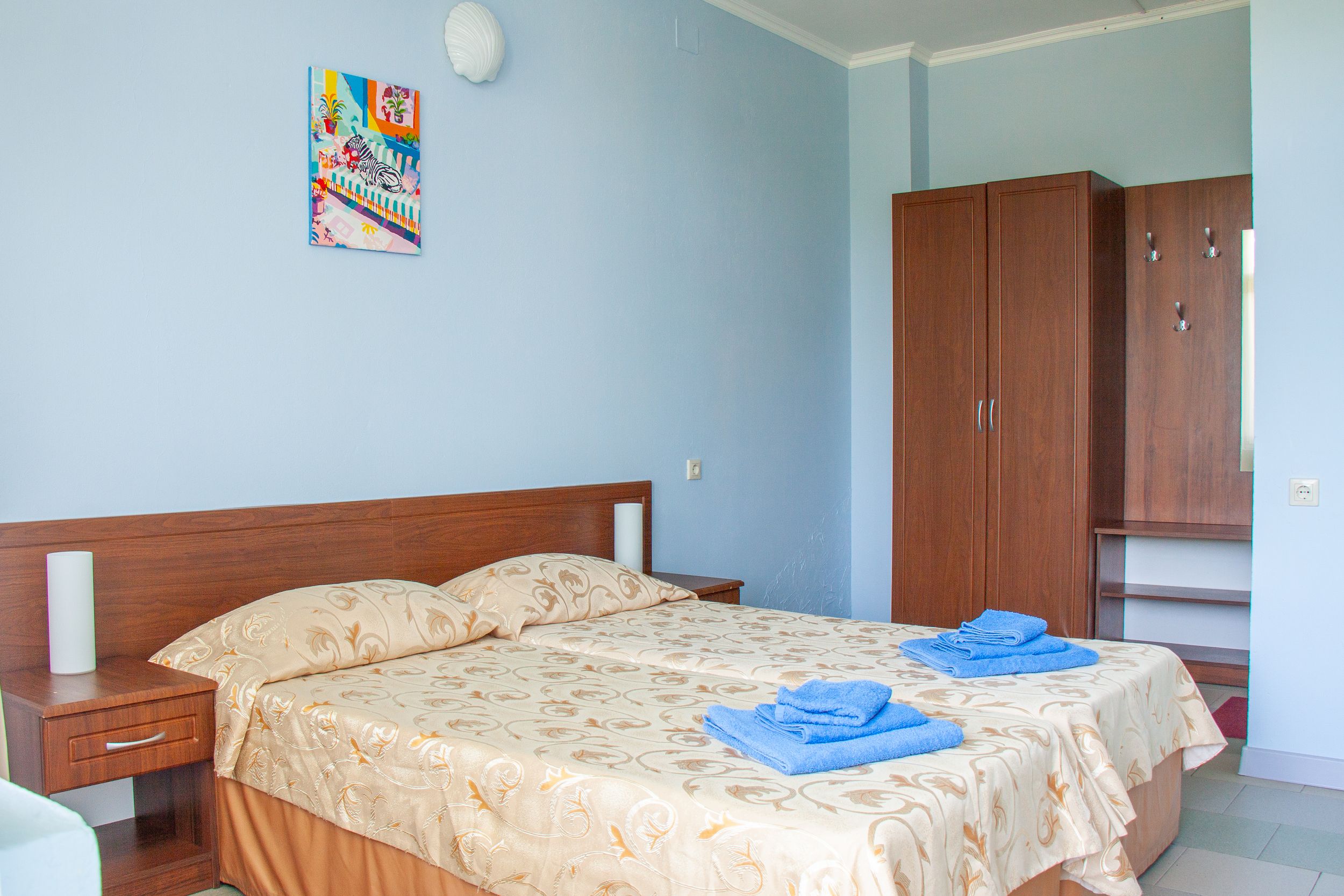 вешалка: ; зеркало: ; кровати односпальные /одна двуспальная кровать: ; прикроватные тумбочки: ; столик журнальный: ; шкаф: ;
