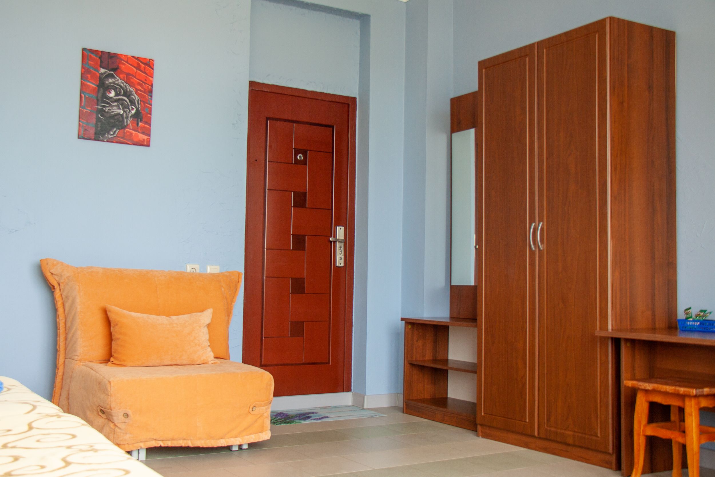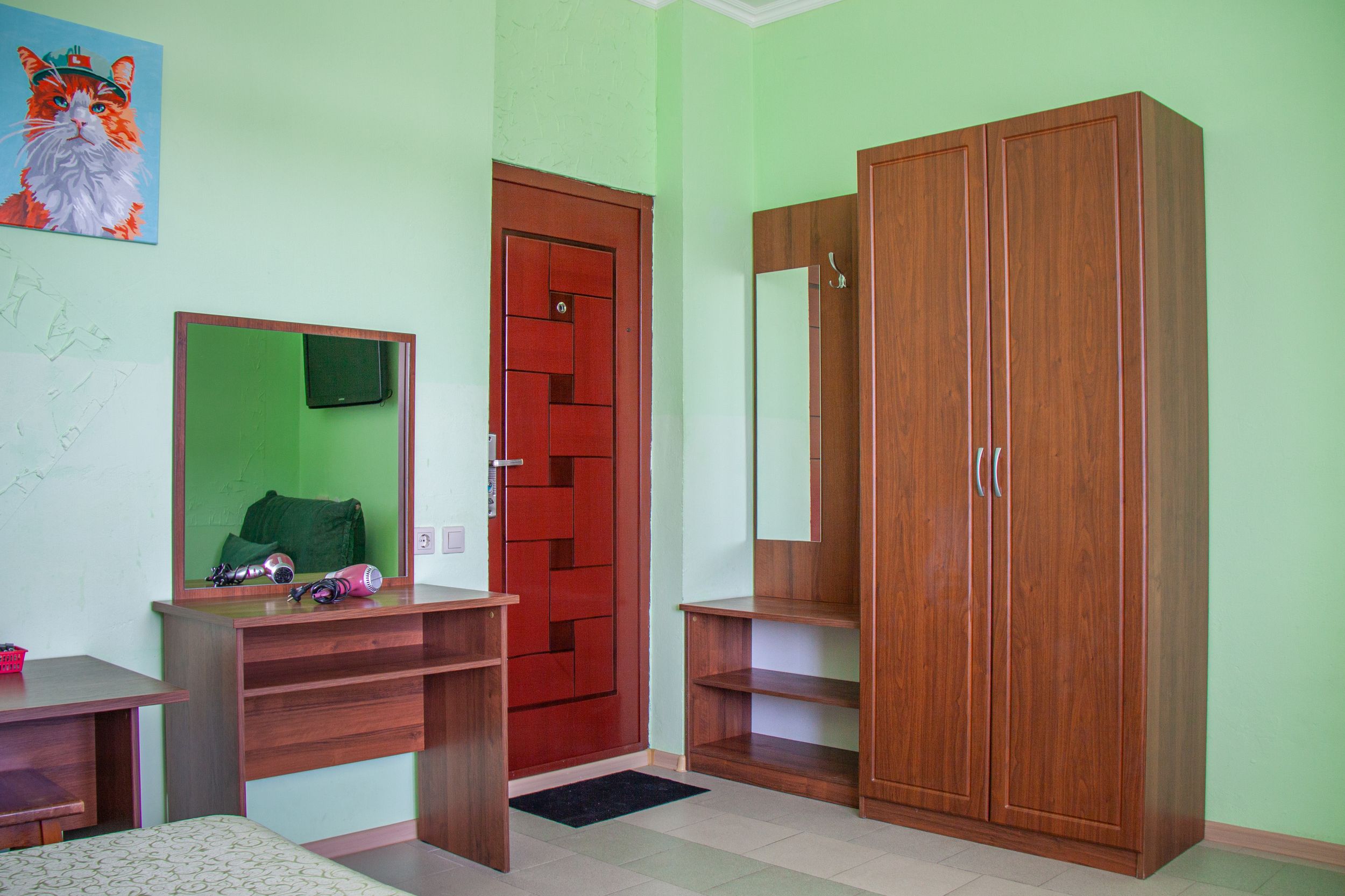 вешалка: ; зеркало: ; кровати односпальные: ; прикроватные тумбочки: ; стол: ; стулья: ; шкаф: ;