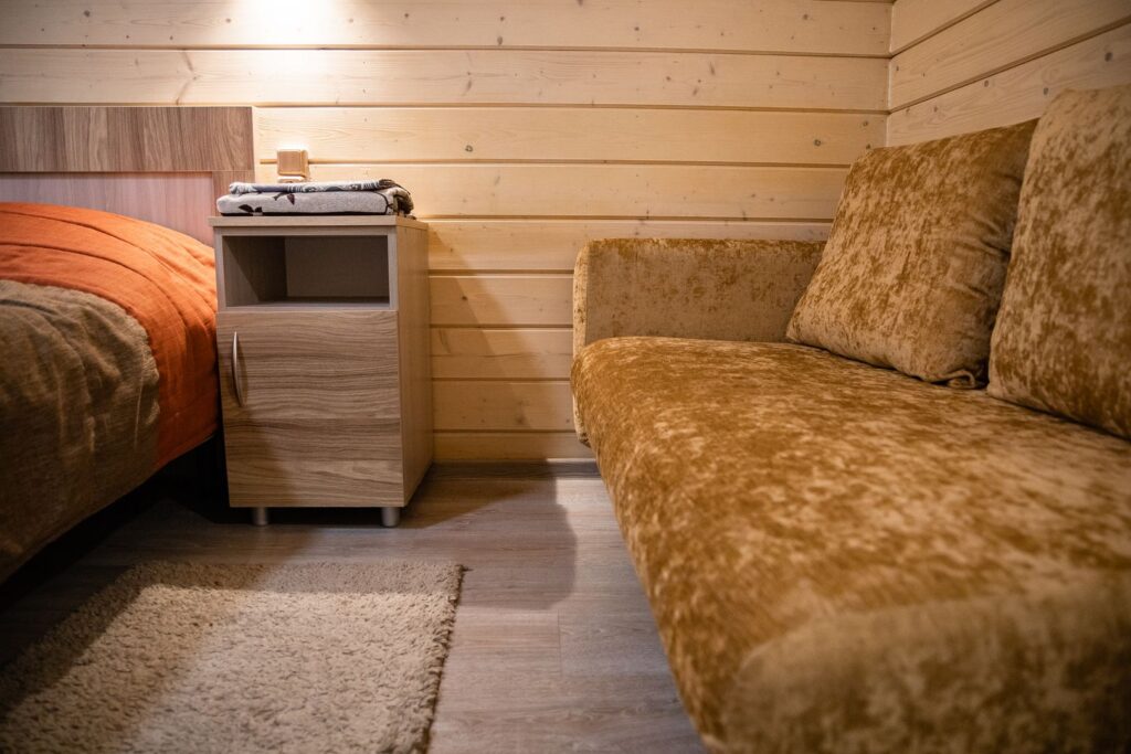 вешалка: ; диван раскладной: ; зеркало: ; кровать двуспальная: ; кухонная мебель: ; прикроватные тумбочки: ; стол: ; стулья: ; шкаф: ;