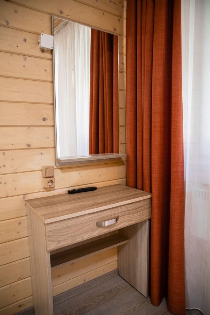 зеркало: ; кровать двуспальная: ; прикроватные тумбочки: ; стол: ; стул: ; шкаф: ;