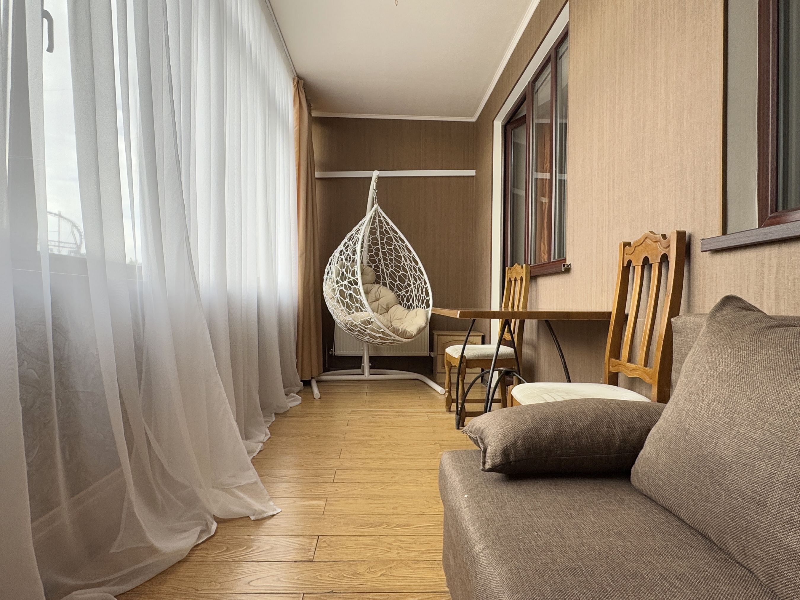 вешалка: ; диван раскладной: располагается на лоджии; зеркало: ; кресло-кровать: ; кровать двуспальная: ; прикроватные тумбочки: ; столик журнальный: ; столик туалетный: ; шкаф: ;