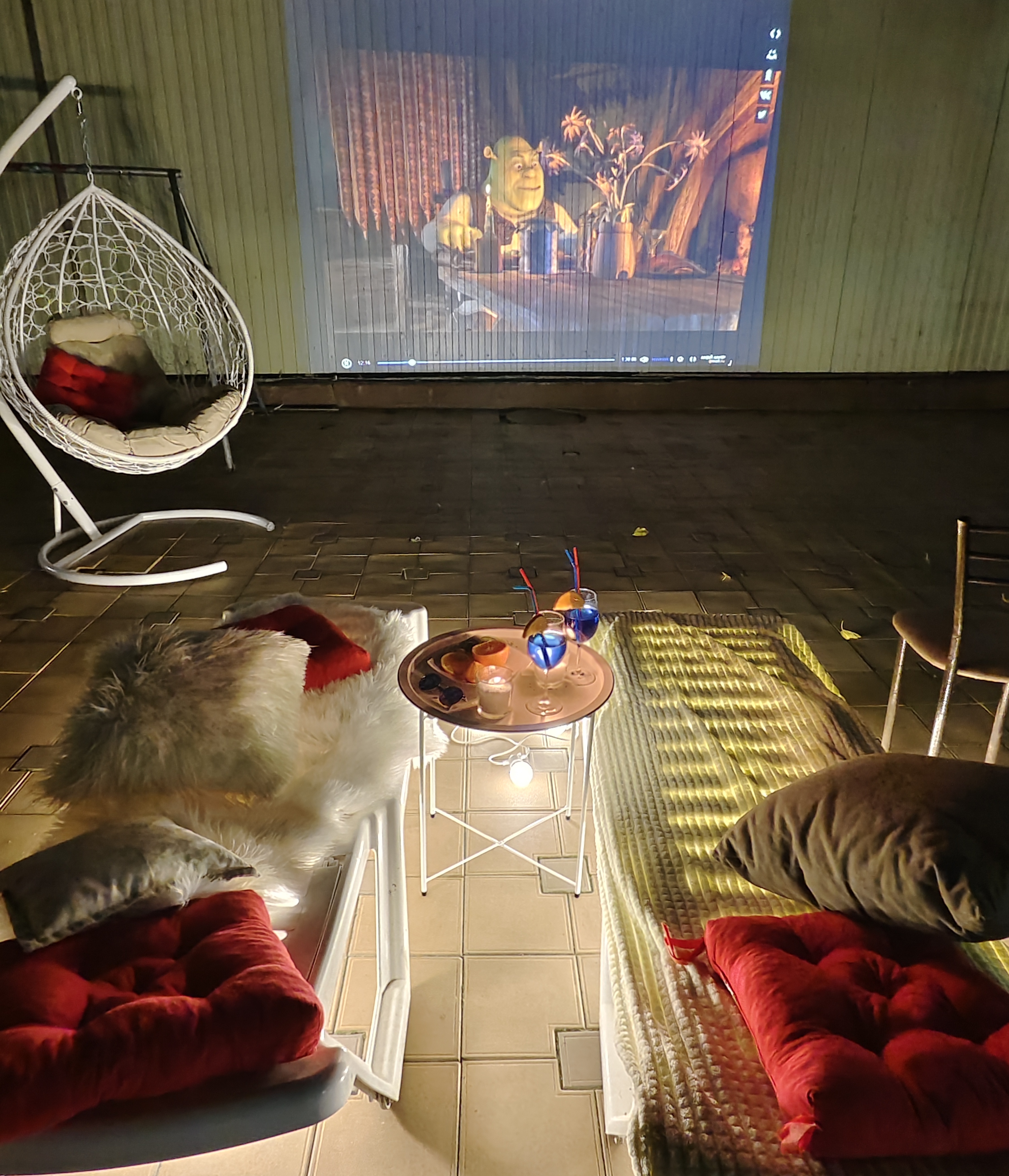 вешалка: ; зеркало: ; кресло-кровать: на террасе; кровать двуспальная: ; прикроватные тумбочки: ; стол: ; столик туалетный: ; стулья: ; шкаф: ;