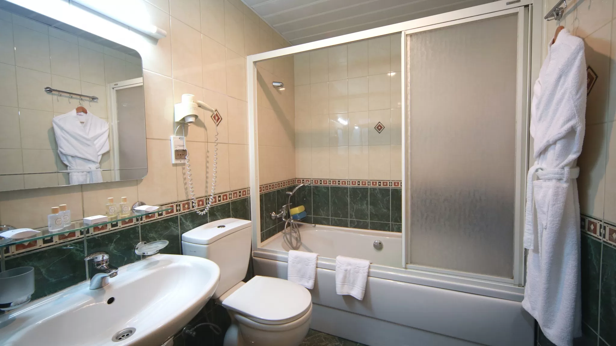 с ванной: ; тапочки: ; туалетные принадлежности: ; фен: ; халат: ;