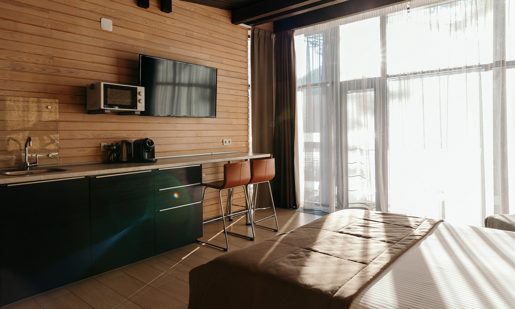 кофемашина: ; микроволновая печь: ; мини-холодильник: ; сейф: ; телевизор ЖК: ; телефон: ; чайный набор посуды: ; электрочайник: ;