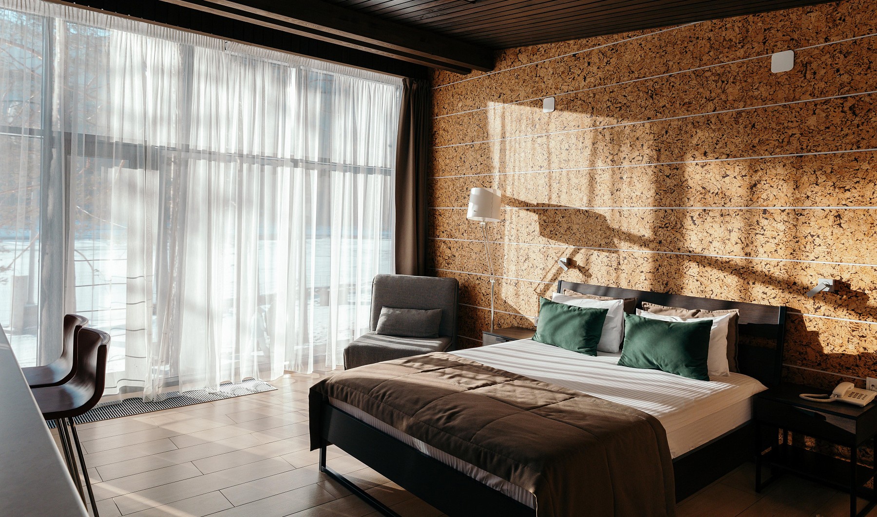 Отельный комплекс включает основной корпус и 12 коттеджей - А, В, С, D, два коттеджа F, пять коттеджей-студий Н. Все корпуса являются 2-этажными, кроме коттеджей F и Н, и выполнены из натуральных экологичных материалов. В основном корпусе находятся стандартные номера, в коттеджах – повышенной комфортности. Оснащение номерного фонда максимальное - санузел, душевая кабина, телевизор, холодильник, сейф, фен, чайник, туалетные принадлежности, тапочки, халаты, Wi-Fi. Дополнительно в номерах коттеджей С, Д, F, Н - мини-кухни, в коттедже Е – полноценная кухня.
