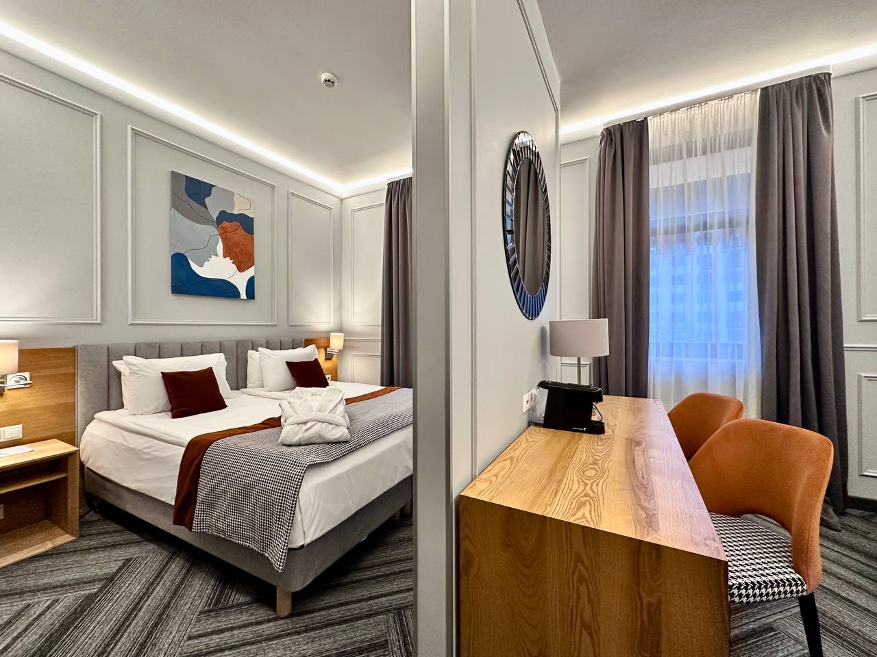 зеркало: ; кровати односпальные /одна двуспальная кровать: ; прикроватные тумбочки: ; стол: ; стулья: ; шкаф: ;