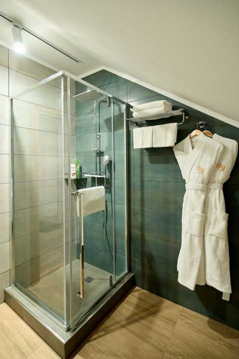 с душевой кабиной: ; тапочки: ; туалетные принадлежности: ; фен: ; халат: ;