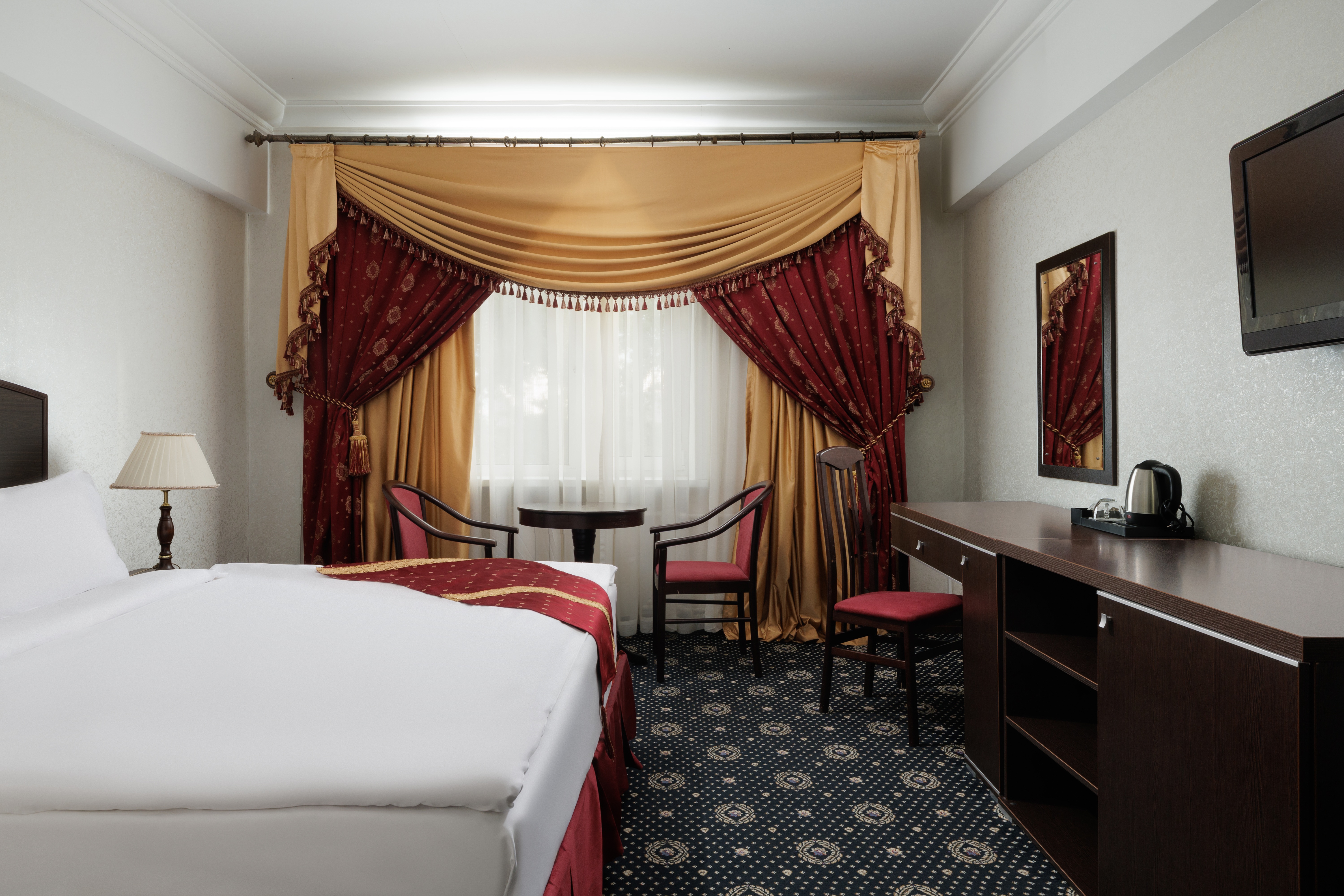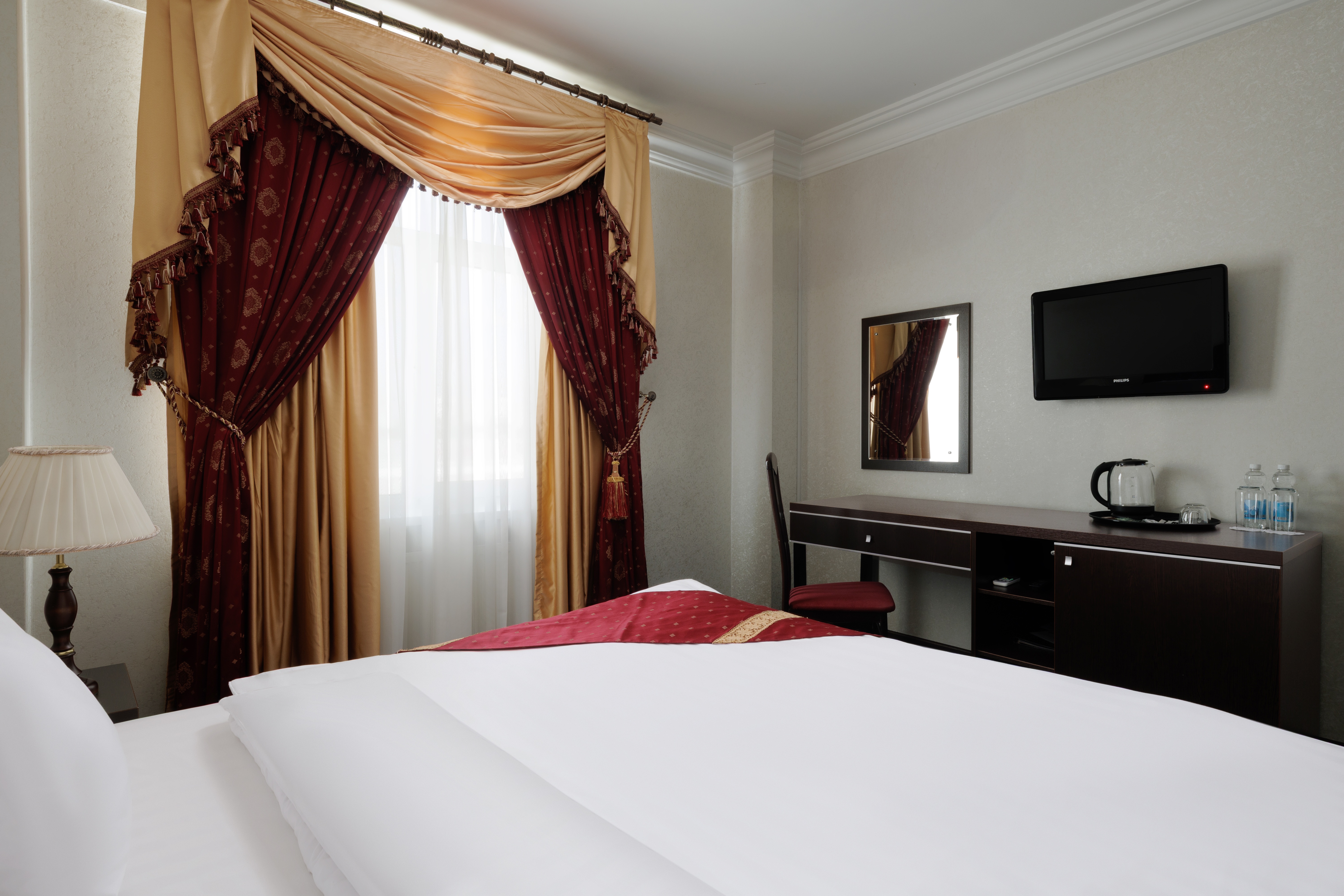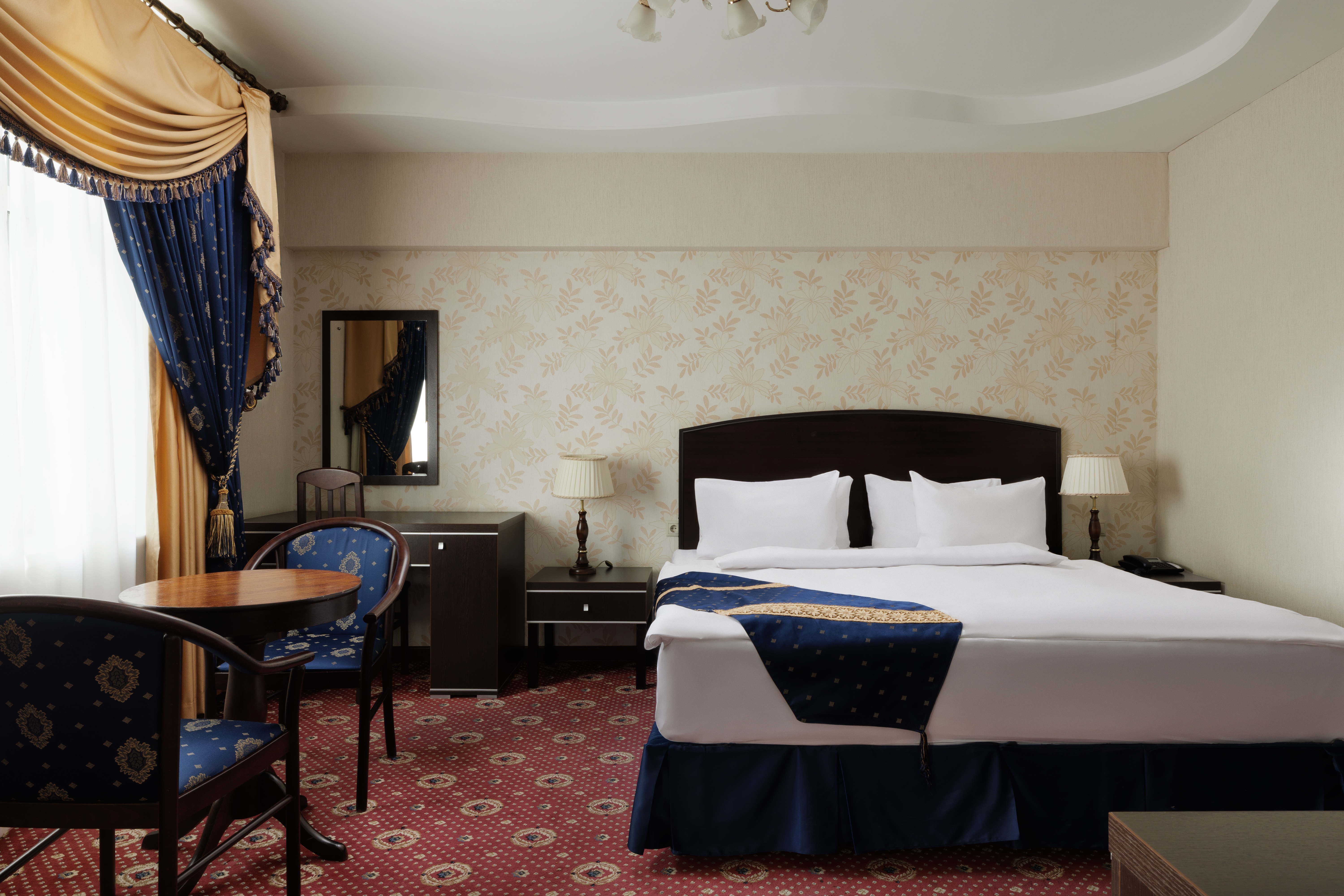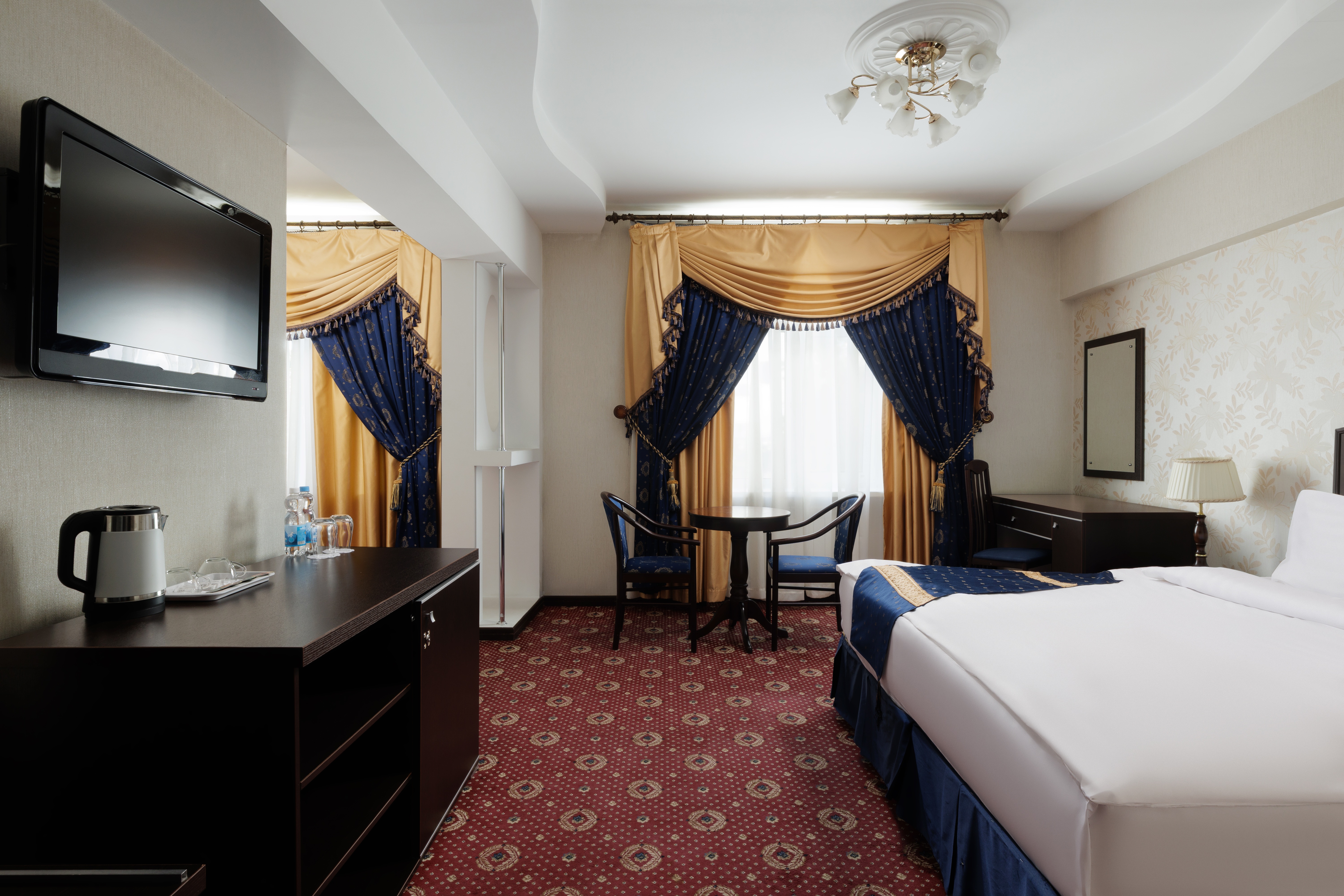 7-ми этажный отель, оснащенный лифтом, включает в себя 2-х местные номера категории Студио, Делюкс, Люкс, Бизнес и Стандарт. Выдержанные в классическом стиле номера, укомплектованные необходимой бытовой техникой – телевизором, кондиционером, холодильником и оснащены ванной комнатой с косметическими принадлежностями для гостей.